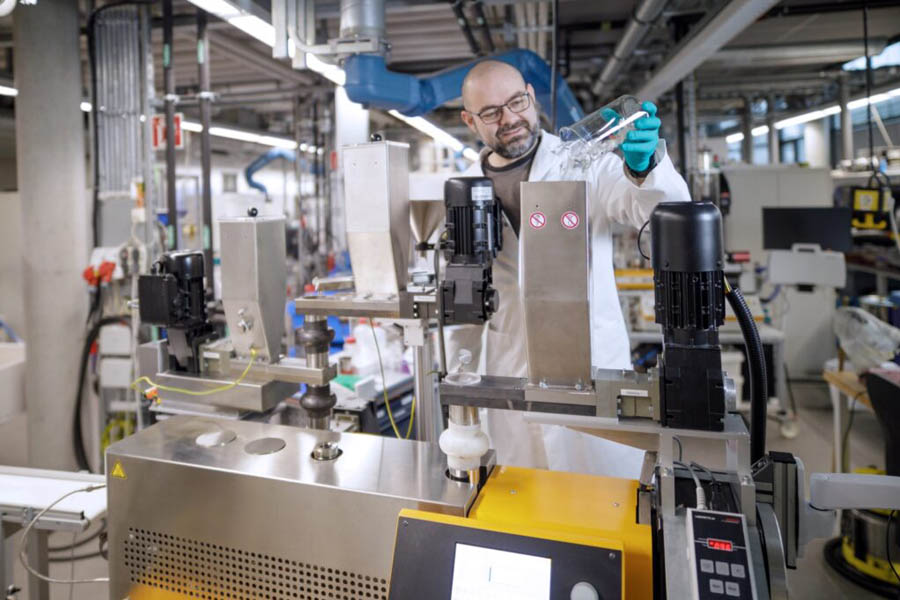Til dette formålet ble polypropylen (PP) fra et avfallssorteringsanlegg for emballasjer brukt i en mulighetsstudie utført av HSB og Fraunhofer IFAM. For å sikre tilstrekkelig renhet viderebehandlet Eckardt og hennes team avfallsmaterialet: Ved universitetets sirkulære økonomilaboratorier malte de plasten, vasket den og skilte uønsket materiale fra hovedstrømmen ved hjelp av en flyte/vask-separator.