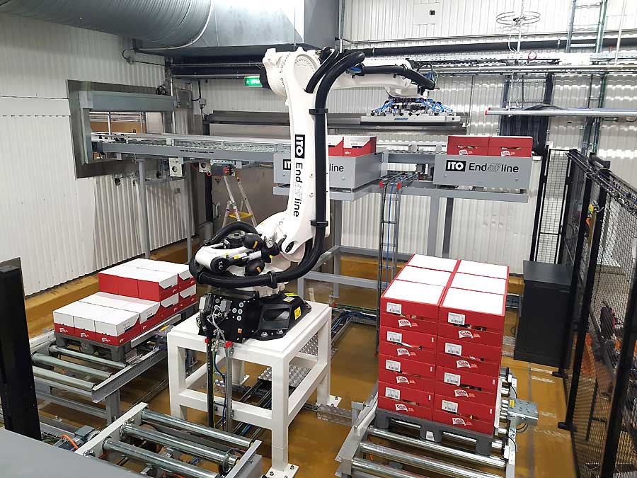 I denne linjen fylles kartongene manuelt før de transporteres til den samme industriroboten for stabling på pall.