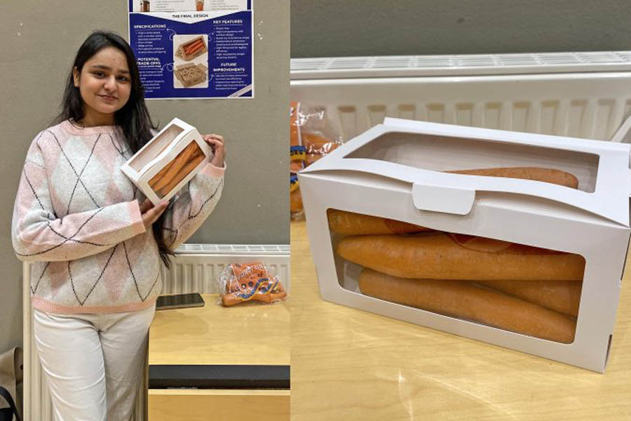 Løsning: Den foreslåtte løsningen er en plastfri, papirbasert emballasje designet for 500 g ferske gulrøtter. Den er laget av jomfruelig papp med et gjennomsiktig vindu laget av algebasert film, som gir synlighet samtidig som den er fullt resirkulerbar. Strukturen er et trekantet prisme med en 90° vinkel, som sikrer effektiv stabling i sekundær bølgepappemballasje og forbedrer transport- og lagringseffektiviteten. Det mikroperforerte vinduet opprettholder høy luftfuktighet samtidig som det tillater skånsom luftstrøm for å forhindre kondens og mikrobiell vekst, noe som bidrar til å forlenge holdbarheten og bevare friskheten. Denne innovative designen kombinerer holdbarhet, produktbeskyttelse og forbrukerappell, og tilbyr et funksjonelt og miljøvennlig alternativ til konvensjonell plastemballasje for gulrøtter.