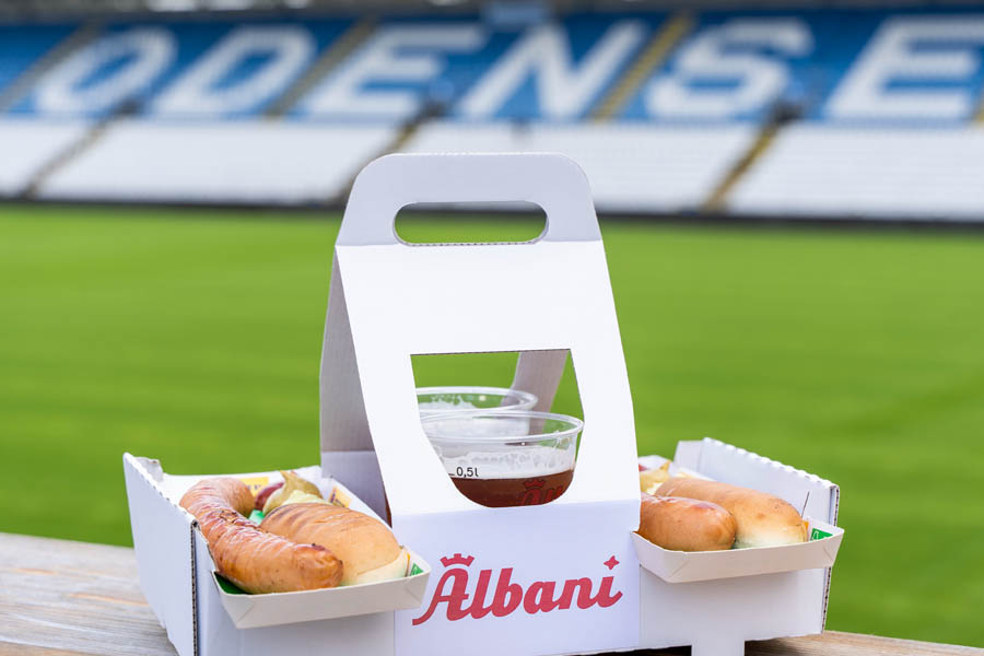 Smurfit Westrock kaller den «Stadium Meal Carrier». Den ble utviklet på forespørsel fra den danske Odense Boldklub. Emballasjen løser problemet med å transportere flere drikkevarer, matvarer og snacks fra kiosken til setet.